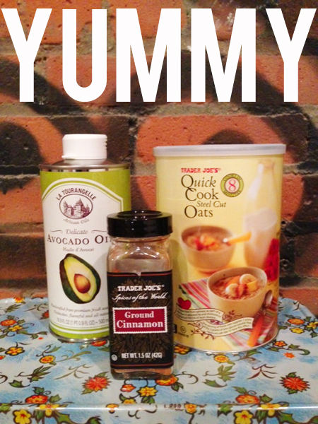Plus, avocado oil is not only delish, but very good for you. Steel cut oats & Cinnamon from Trader Joes.. and Avocado Oil from Whole Foods! Mangia!
